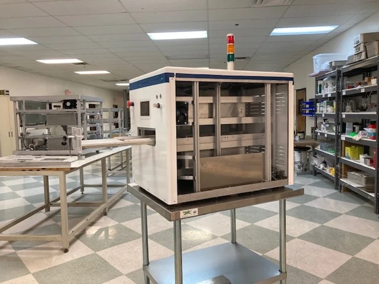 In operation, the Stellar-Rad™ operator slides easy-to-use trays holding the material in between pairs of upper and lower FPXS. These emit a highly uniform pattern of x-rays from both sides, which ensures a uniform dose throughout. FPXS has high power efficiency compared with x-ray tubes, which means Stellar-Rad™ consumes far less power than x-ray tube irradiators and can use standard wall power. The cooling and insulation system has no moving fluids or cooling lines to break down. The high voltage power sources are built into the same casing as the FPXS, eliminating the need for bulky and troublesome high voltage cables.